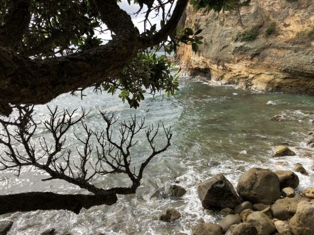 Am zweiten Tag war das Wetter noch schlechter, am Programm stand als erstes ein Besuch des „Hot-Water-Beach“. Dieser Strand im Norden ist etwas ganz besonderes, unterhalb gibt es relative nah zur Erdoberfläche Magma vorkommen, welches das Grundwasser erhitzt. Durch das Graben mit einer schaufel kann man diese Grundwasser an die oberfläche holen und sich so seine eigene heiße Quelle schaffen. Das Wasser war wirklich sehr heiß, fast ein bisschen zu heiß für meinen Geschmack, das Meer war deutlich kühler aber nacher war die heiße Quelle dann doch sehr anggenehm.